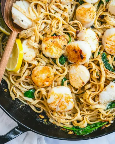 Oto wspaniały przepis na przegrzebki, który jest elegancko łatwy do przygotowania: Makaron z przegrzebkami! Niezależnie od tego, czy chcesz zaimponować gościom na kolacji, przygotuj a romantyczna kolacja lub po prostu nakarm swoją rodzinę w tygodniu: ten przepis jest idealny. Smażone przegrzebki są słodkie, maślane i delikatne, umieszczone na delikatnym makaronie i akcentowane aromatami cytryny, czosnku i ziół.