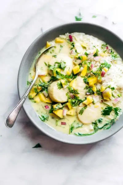 Źródło zdjęcia: pinchofyum.comPrzegrzebki w zielonym curry z salsą mango i kolendrą