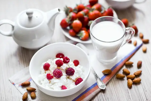Pomiń białko kazeinowe w proszku i wybierz sera, który jest bogaty w pochodną produktów mlecznych i mlecznych. Jest to również powoli chroniące białko, które pozostawia dłuższe uczucie i może pomóc lepiej spać z tryptofanem aminokwasowym. Połącz go z jagodami bogatymi w przeciwutleniacze, takie jak truskawki lub maliny, i uzupełnij garść migdałów dla niektórych dodatkowych białek i zdrowych tłuszczów.