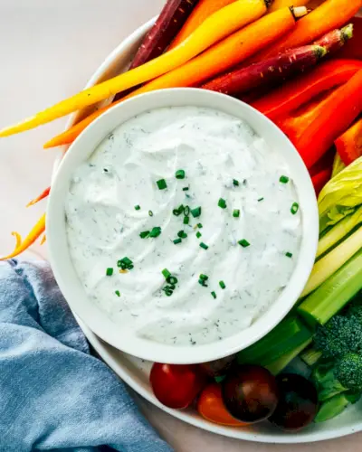 Oto nasz sprawdzony dip wegetariański, który będziesz chciał robić wielokrotnie! Jest wyjątkowo kremowy i pikantny, a do tego łatwo go ubić z odpowiednią kombinacją przypraw. Nie potrzebujesz tutaj pakowanych przypraw ranczo! Ten zdrowy dip warzywny to przekąska, którą wszyscy pokochają: a można ją przygotować w zaledwie 5 minut.