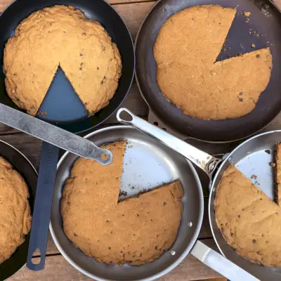 Patelnia ze stali węglowej powinna działać równie dobrze w piekarniku, jak na płycie kuchennej i powinna równomiernie przewodzić ciepło, tak aby środek patelni nagrzewał się tak samo jak zewnętrzne rogi patelni. Aby przetestować możliwości podgrzewania, na każdej patelni przysmażyliśmy udka kurczaka ze skórą, aby sprawdzić, czy uda nam się uzyskać złotą, równomiernie chrupiącą skórkę. Aby przetestować działanie zapobiegające przywieraniu, jajecznicę sprawdziliśmy, jak gładka jest powierzchnia każdej patelni. Na koniec upiekliśmy ciasteczka z kawałkami czekolady, aby ocenić, jak każda patelnia radzi sobie w piekarniku.