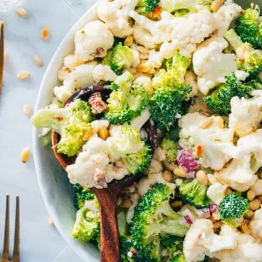 Ta sałatka z brokułów i kalafiora jest idealna łatwa sałatka do ubijania wszystkich posiłków! Oto kilka pomysłów na więcej przepisy na brokuły I przepisy na kalafior spróbować: