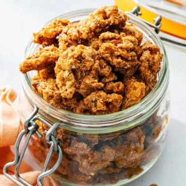 Jeden z najsmaczniejszych sposobów gotowania z orzechami włoskimi? Spróbuj tego Przepis na kandyzowane orzechy włoskie ! Ten niezawodny przepis pozwala uzyskać chrupiącą, przyprawioną cynamonem polewę z cukierków, która łączy w sobie bogate, ciągnące się orzechy. W garści smakują niesamowicie i są nieskończenie wszechstronne: używaj ich jako dodatku do sałatek, lodów, naleśników, płatków owsianych i nie tylko. Możesz też wykorzystać je jako prezenty na parapetówkę lub prezenty świąteczne! Za każdym razem, gdy przygotowujemy partię, jesteśmy obsesja : podjadanie ich w formie zwykłej przekąski, a nawet dodawanie ich do lunchu naszego 5-latka w ramach smakołyku.