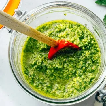 - Zrób to bez nabiału: przejdź do Wegańskie pesto i zamień bazylię na rukolę.