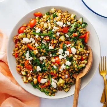Nie ma nic lepszego niż skromna soczewica. A jeden z naszych ulubionych sposobów jego wykorzystania? To łatwe przepis na sałatkę z soczewicy ! Wykorzystuje wszystko, co dobre w tej bogatej w białko roślinie strączkowej i sprawia, że śpiewa. Smak wyskakuje z pikantnymi i pikantnymi nutami, łącząc delikatną soczewicę z mocnym dressingiem Dijon z białego octu winnego, chrupiącym ogórkiem, świeżymi pomidorami i słoną fetą. Pozostaje aromatyczny w lodówce przez kilka dni, dzięki czemu resztki są wyrównane lepsza !