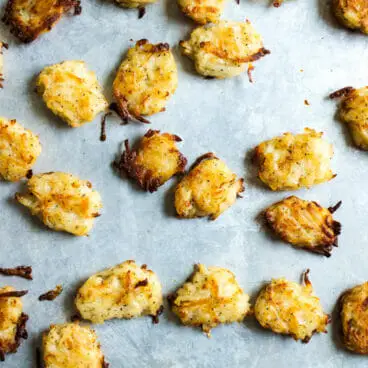 Jeśli zostały Ci domowe tater tots, polecam podgrzać je na patelni na kuchence lub w piekarniku. Aby podgrzać tater tots w piekarniku, wyłóż blachę do pieczenia papierem pergaminowym i piecz tots w piekarniku nagrzanym na 150°F przez 15-20 minut. W połowie czasu gotowania sprawdź tater tots, aby upewnić się, że się nie przypalają lub nie stają się zbyt chrupiące z jednej strony. Niektóre piekarniki palą się mocniej niż inne, dlatego może zajść potrzeba zmniejszenia ogrzewania w połowie!