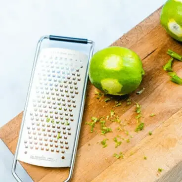 Oto jak obrać skórkę z limonki: najlepszy sposób: użyj mikrosamolotu . Mikropłat to tarka, która wygląda jak narzędzie do obróbki drewna: stąd wziął się pomysł! To podręczna metalowa płytka z ostrymi otworami. Tarcie żywności za pomocą mikropłata jest szybsze i bardziej spójne. Alex i ja używamy naszego przez cały czas! Aby zrobić to samo, możesz również użyć drobnych otworów na tarce pudełkowej.