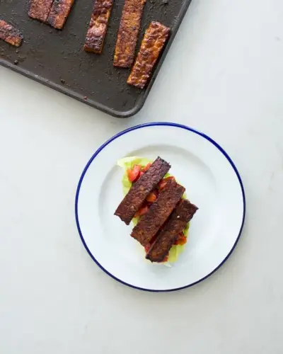 Bekon Tempeh to bogaty w białko sposób na zrobienie wędzonego, słonego wegańskiego spinu, który smakuje jak prawdziwy! Idealny do BLT i obok jajecznicy.